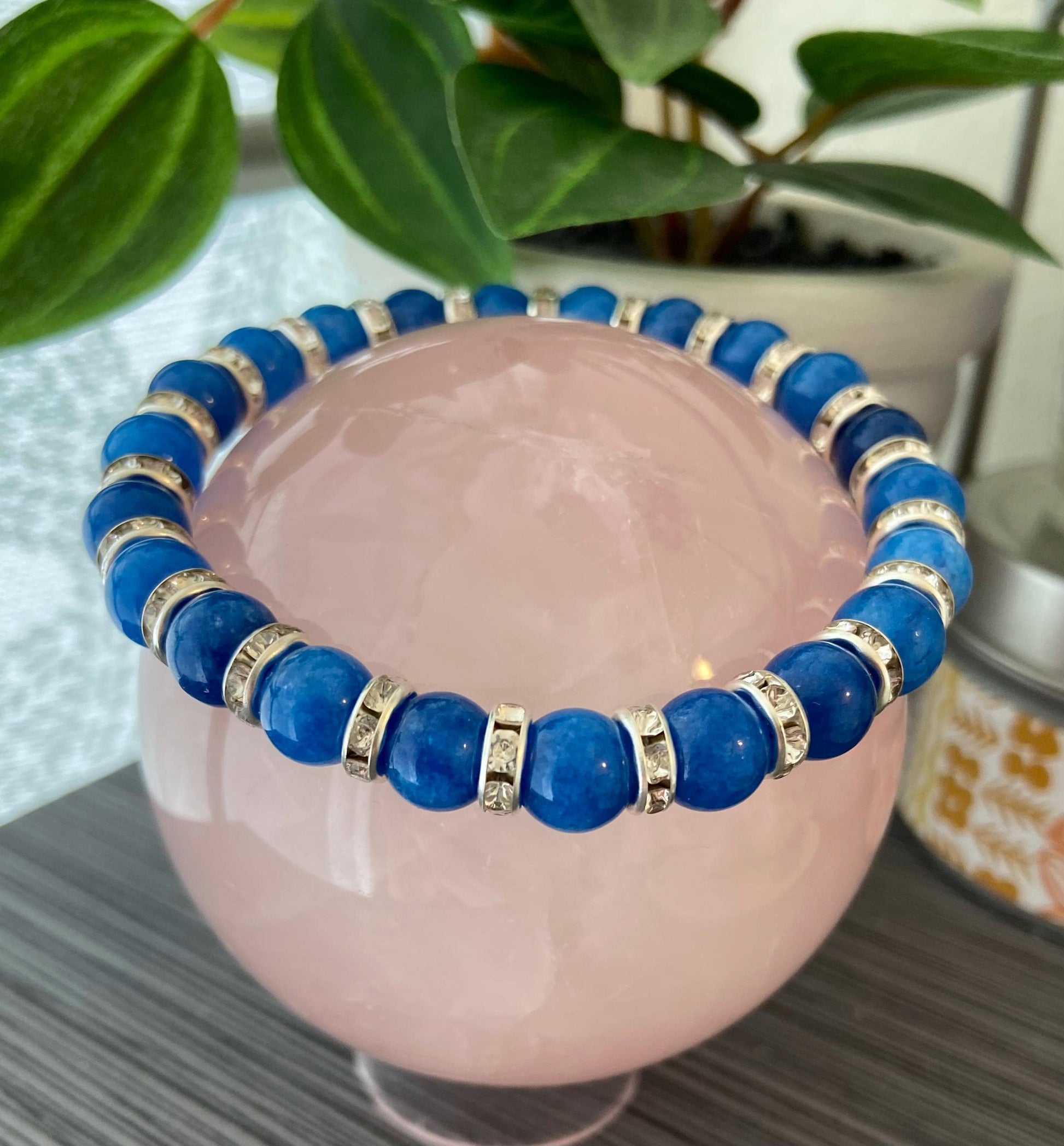 Handmade 8mm genuine kyanite and silver plated crystal rondelle bracelet. Made with stretchy elastic cord. Packed in organza gift bag.
