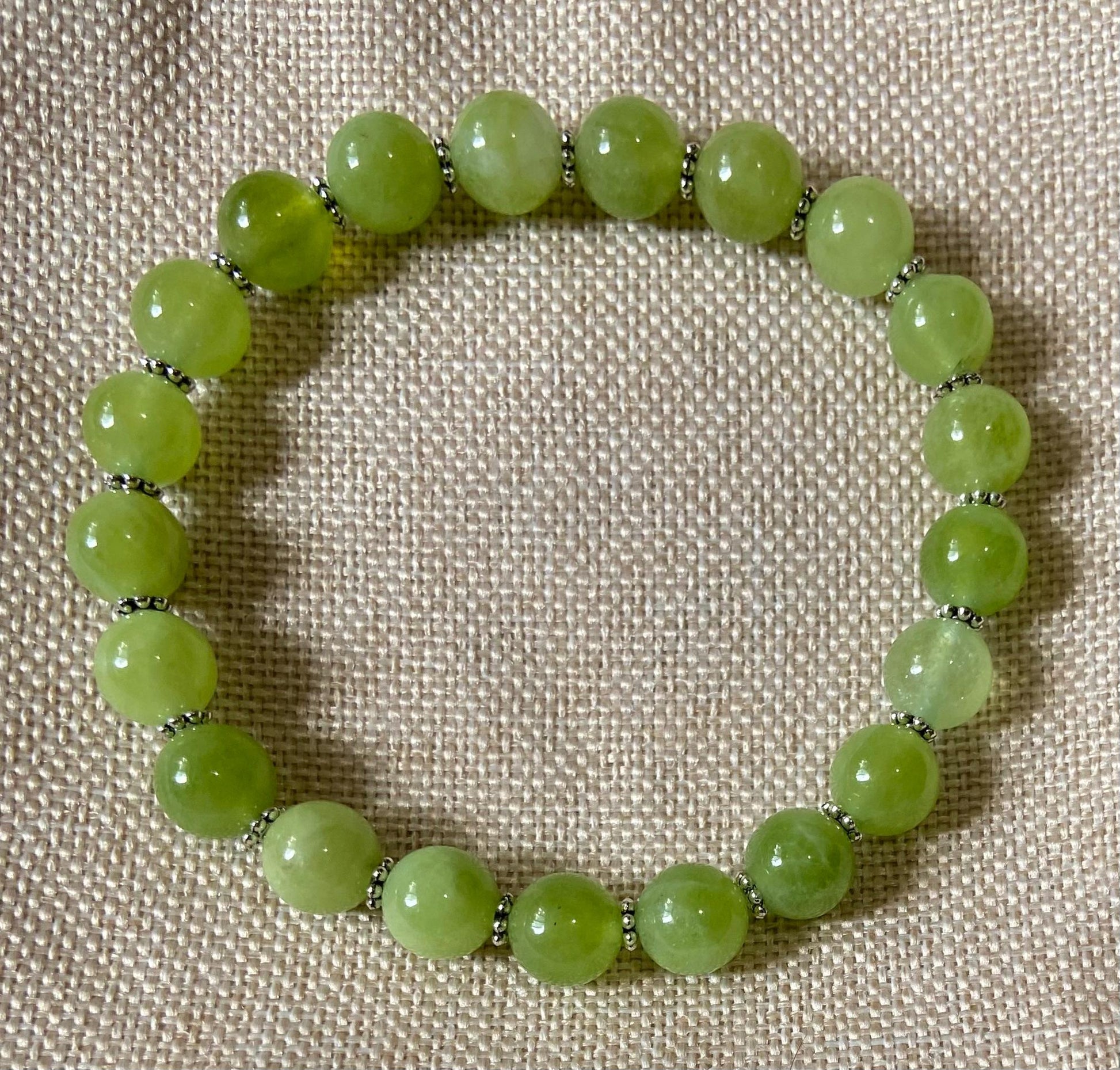 Handmade 8mm genuine peridot bracelet with silver-plated spacers. Made with stretchy elastic cord. Packed in organza gift bag.
